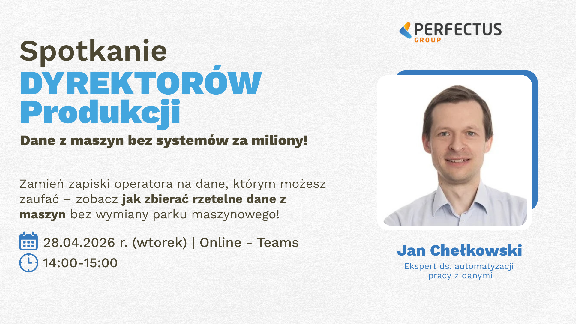 Podczas tego spotkania Jan Chełkowski (Perfectus Group) wraz z ekspertem z FITMECH pokażą Ci, jak pozyskiwać dane z maszyn i ustawić raportowanie bez wielomilionowych inwestycji w systemy.